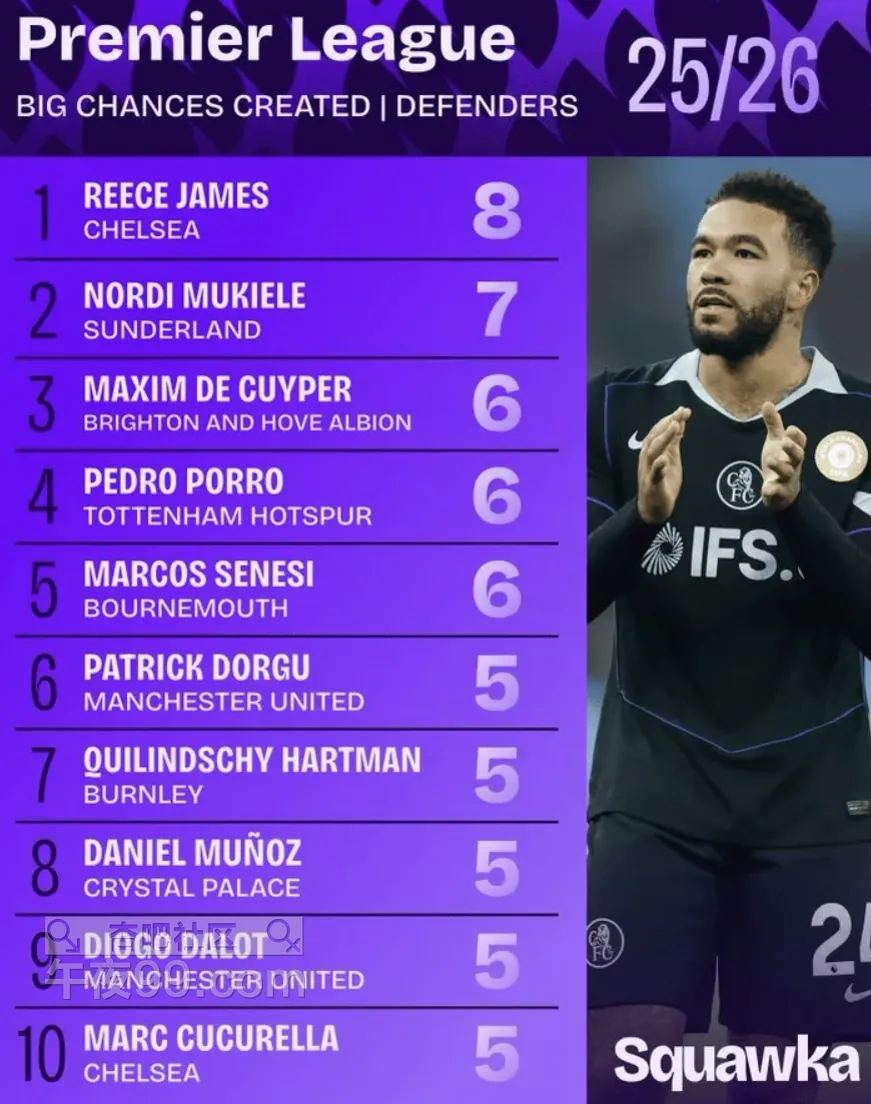 [|足球快报] 8次,里斯-詹姆斯是本赛季英超创造绝佳机会最多的后卫球员 |
